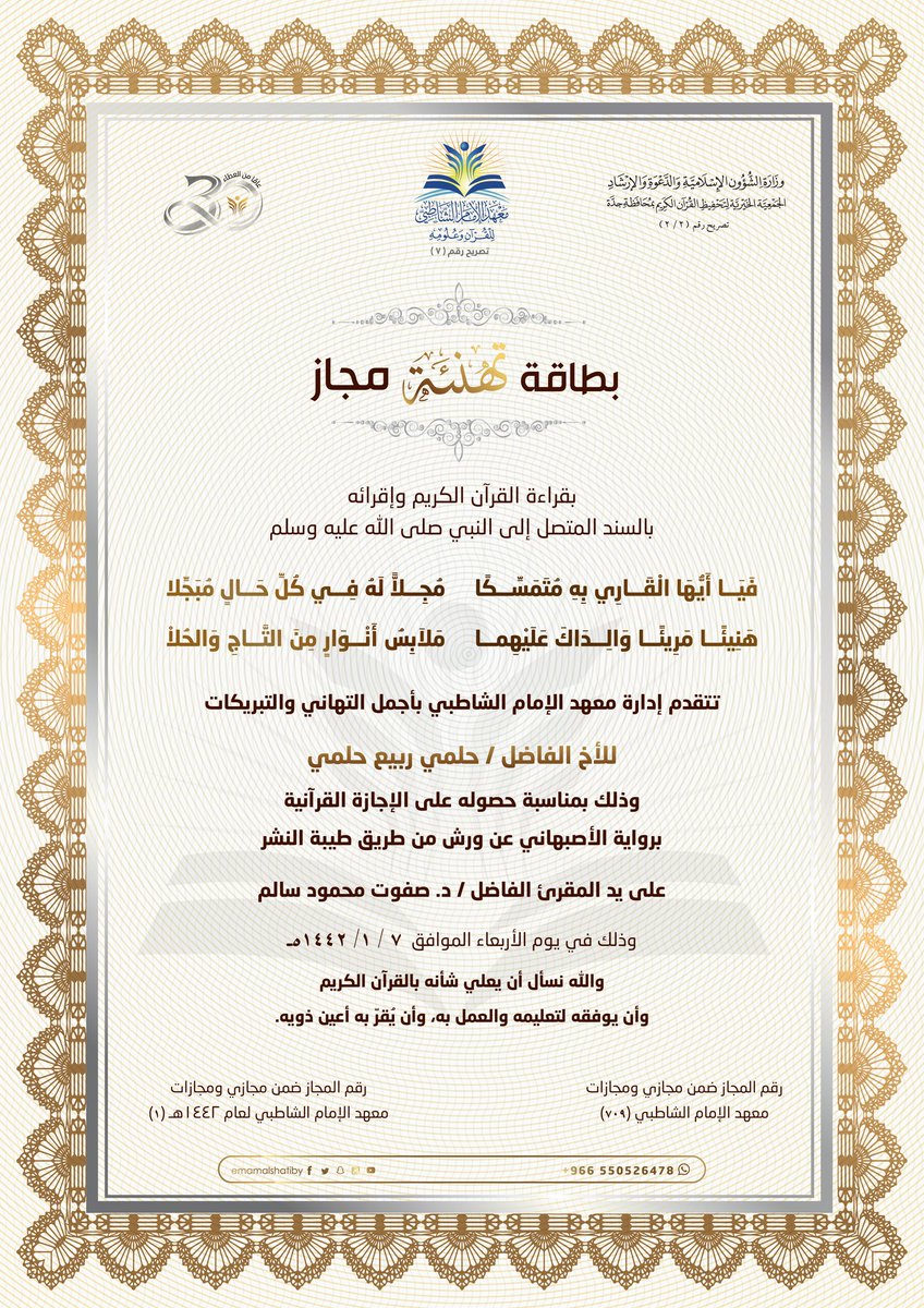 معهد الإمام الشاطبي. معهد الإمام الشاطبي للقرآن وعلومه بجدة أحد المعاهد الأولى في المملكة العربية السعودية والتي تهدف لإعداد معلمي ومعلمات القرآن وإحياء سنة إقراء القرآن الكريم. أنشئ معهد الإمام الشاطبي عام 1410هـ تحت إشراف الجمعية الخيرية لتحفيظ القرآن الكريم خيركم بمحافظة جدة موجها خدماته لكافة شرائح المجتمع في مجال القرآن الكريم وعلومه. أكاديمية الإمام الشاطبي للإقراء. كان مذهب الإمام الشاطبي أن يأخذ بالدليل الأقوى ويذر سواه ما لم يوجب ذلك حرجا وإلا كان يجمع بينهما فيقدم الكتاب على السنة والسنة على القياس والقياس على قول الصحابي وقول الصحابي على.
