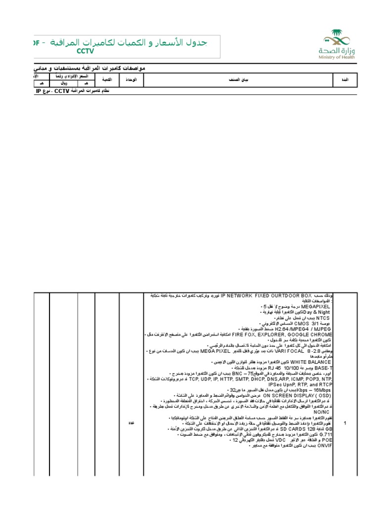 1 جدول الأسعار والكميات لمشروع كاميرات المراقبة بوزارة الصحة
